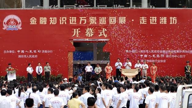 6月18日,由中国人民银行济南分行和潍坊市人民政府联合主办的“金融知识进万家巡回展·走进潍坊”在潍坊市富华国际展览中心正式拉开帷幕。人民银行济南分行副行长黄向庆、潍坊市人大副主任李本跃、市政府副市长刘伟、市政协副主席郑汝智、军分区常委后勤部长张瑞玉、市纪委常务副书记衣光明、华夏银行济南分行副行长齐延升、市金融办主任李传顺、人行潍坊中支行长刘福毅、潍坊银监分局局长陈福成等领导同志出席,市各金融机构、部分企业、学校等社会各界公众1000多人参加。中国人民银行济南分行副行长黄向庆,潍坊市副市长刘伟分别致辞。